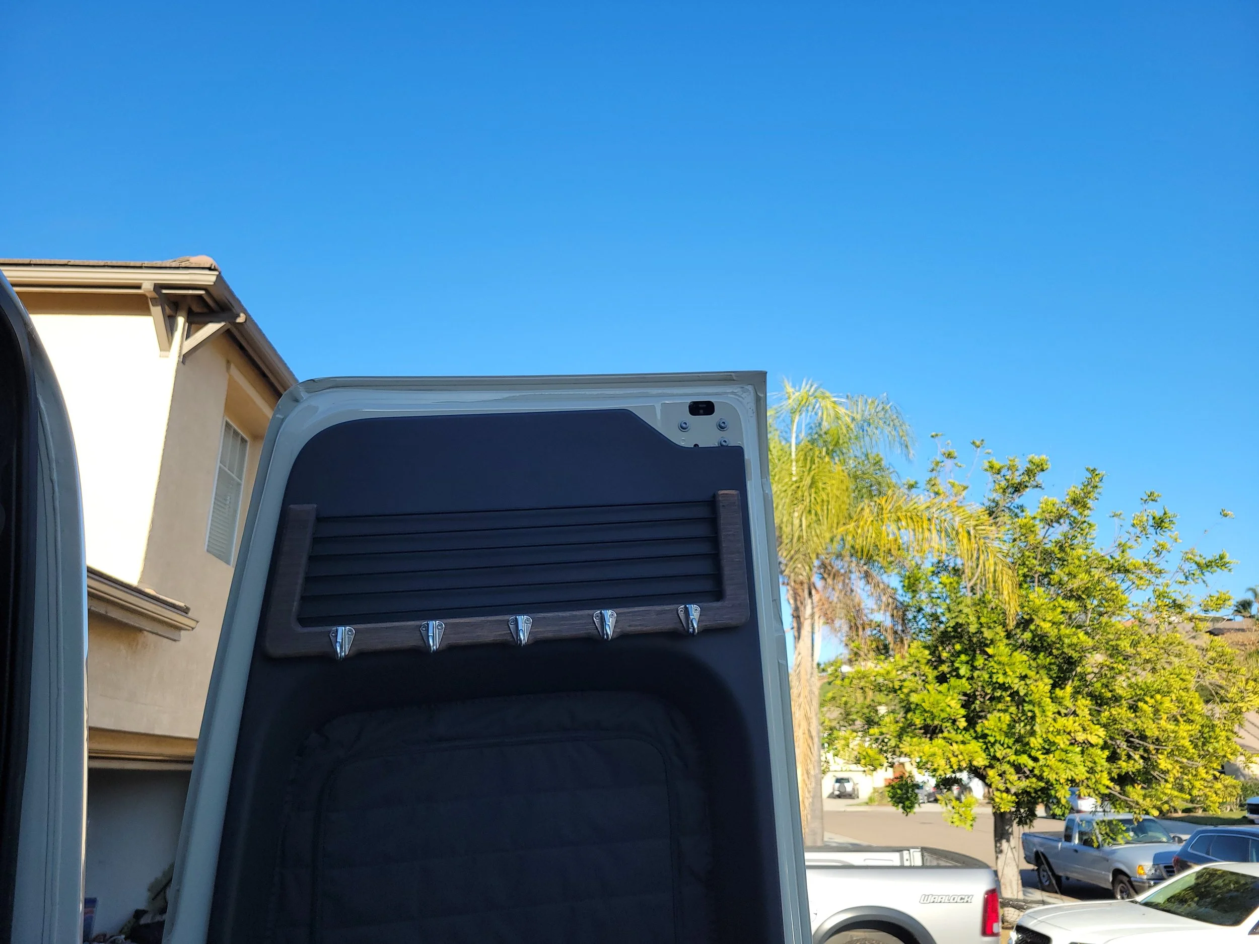 Perhaps the best place to stow soft bulky items is against the back doors of your van. This location is often underutilized, and items stowed there add to the insulation of the doors. We designed Doordrobes around low-profile locking hooks and a retaining cord further down the door to keep items snug against the door. The cords also prevent stowed items from swinging into the “gap” when the doors are opened and closed.